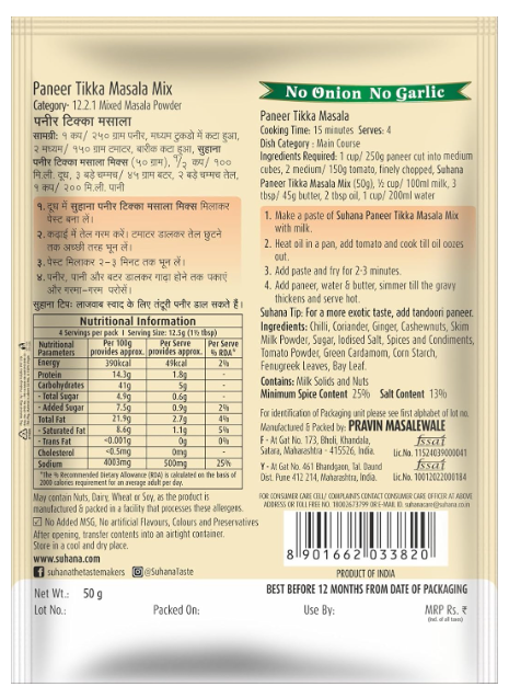 Suhana Paneer Tikka Mix No Onion No Garlic 50gm